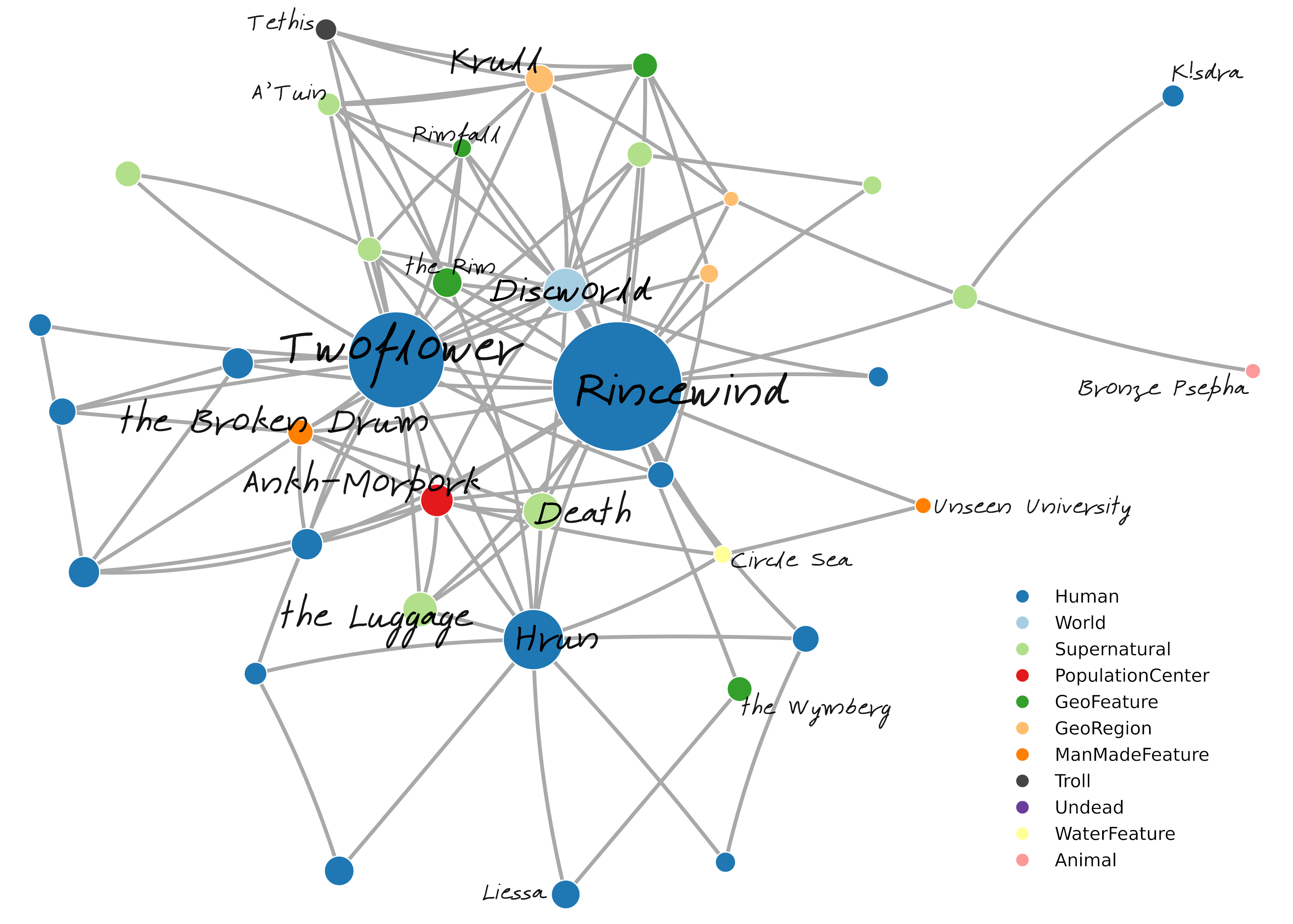 And this has also been done for several mythological or classical texts as well, e.g., the Icelandic Sagas. It is common to compare these artificial networks to real social networks. However, if locations are so important to a story, why aren’t they included in these networks? My The Colour of Magic (STP’s first Discworld novel) network at the top of the page includes locations. The following describes how I created it.